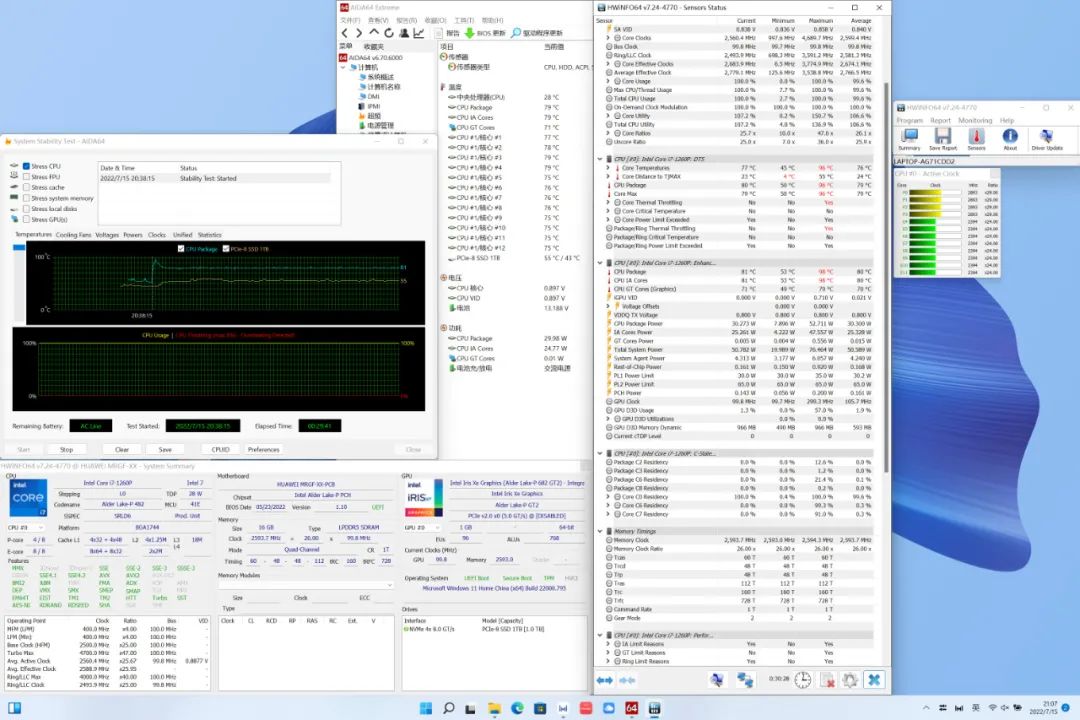 在满载状态下,CPU温度最高96℃,稳定在77℃,功耗30W,P核频率2.9GHz、E核频率2.4GHz。