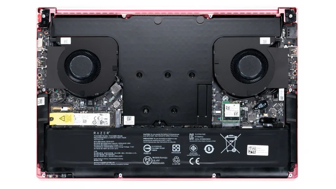 上图是雷蛇 灵刃14 粉晶版的拆机实拍图,均热板双风扇的组合。