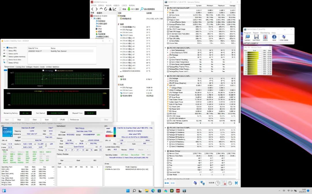 在满载状态下,CPU温度最高87℃,稳定在79℃,功耗45W,P核频率3.5GHz、E核频率3.1GHz。