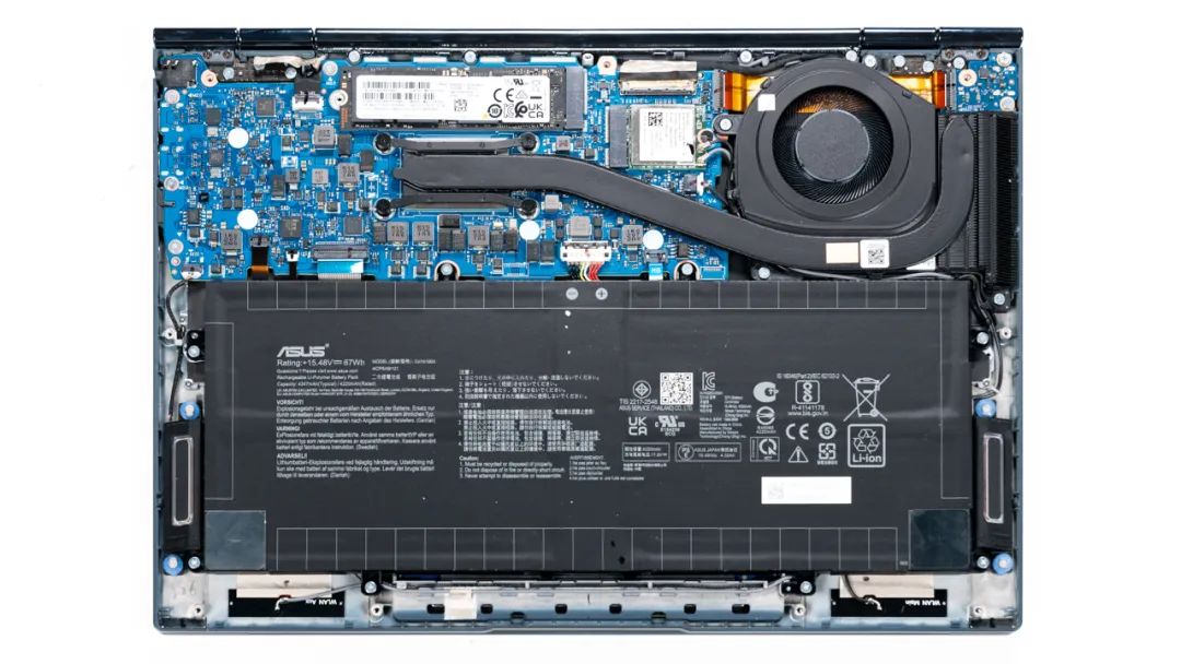 上图是华硕灵耀X 13的拆机实拍图,单风扇单热管的组合,采用侧出风的布局。