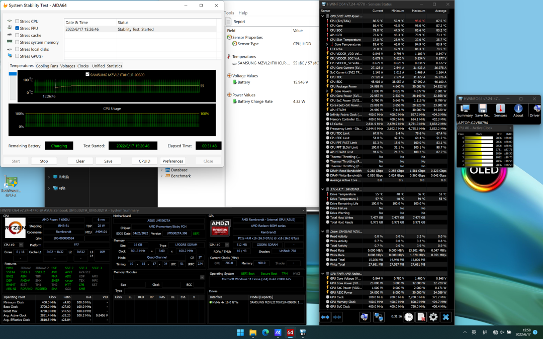 总的来说,华硕灵耀X13的散热表现不错,这么薄的机身下能稳定25W功耗,接近满血释放锐龙7 6800U(28W)的性能,且表面温度没失控,已经很不容易了。