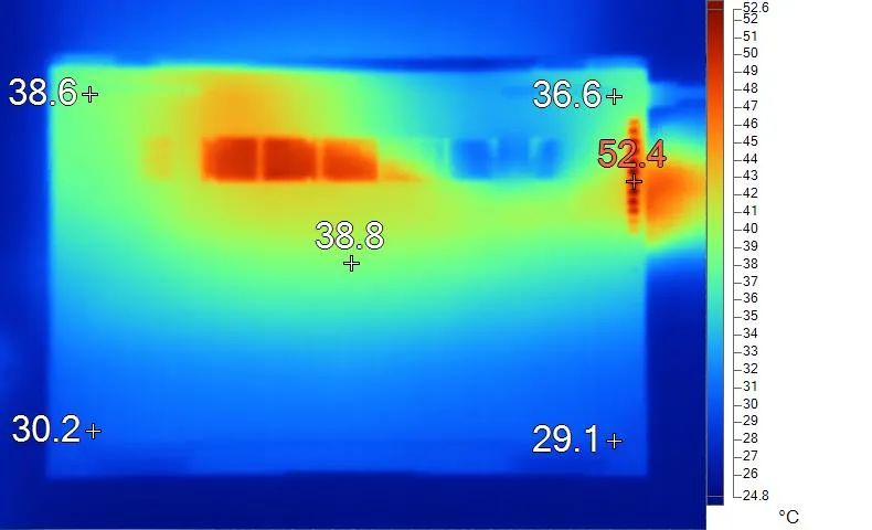 表面温度如上图所示,键盘键帽最高43.1℃出现在键盘右侧区域,WASD键为34.5℃,方向键31.7℃。左腕托温度为28.7℃,背面中心点38.8℃。