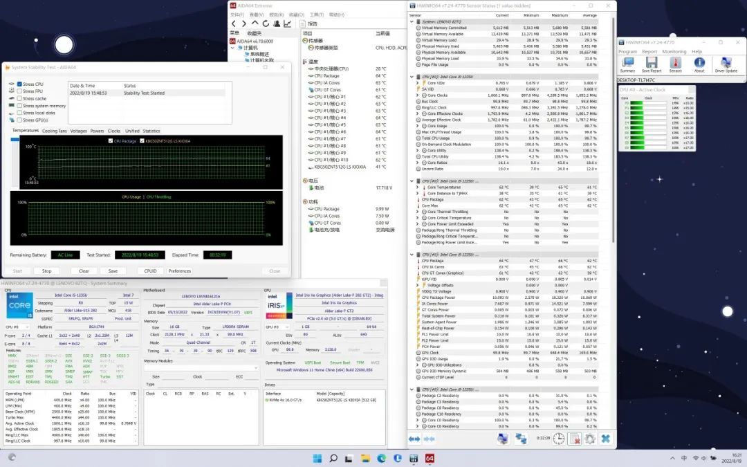 在满载状态下,CPU温度最高89℃,稳定在72℃,功耗15W,P核频率2.6GHz,E核频率2.3GHz。(平板模式下会限制在10W)