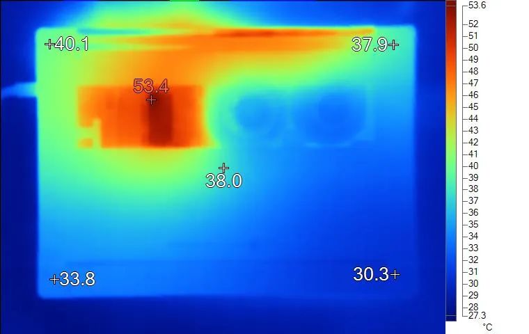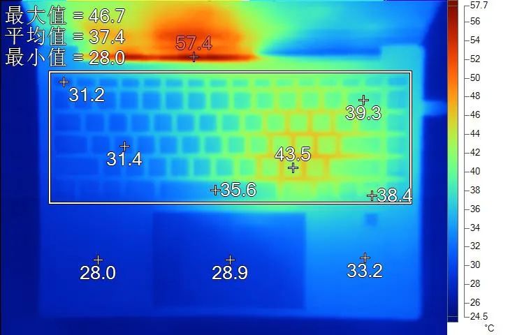 表面温度如上图所示,键盘键帽最高43.5℃出现在键盘符号键“>”周围区域,WASD键为31.4℃,方向键38.4℃。左腕托温度为28℃,背面中心点28℃。