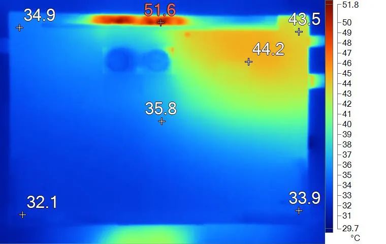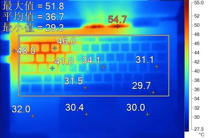 总的来说,X1 Carbon的散热偏静音取向,就算是满载,风扇噪音也很低,但为此降低了性能释放,由于核心在键盘左侧,所以上图该位置温度偏高。