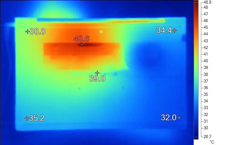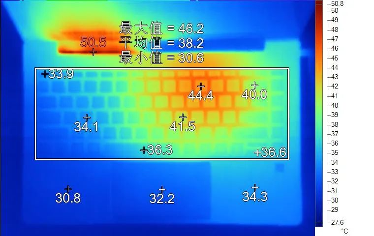 表面温度如上图所示,键盘键帽最高44.4℃出现在键盘数字键“0”上,WASD键为34.1℃,方向键36.6℃。左腕托温度为30.8℃,背面中心点39℃。