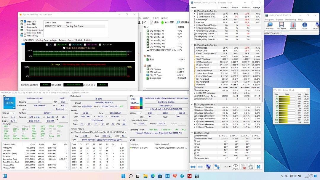 在满载状态下,CPU温度最高98℃,稳定在85℃,功耗30W,P核频率维持在3.0GHz,E核频率维持在2.4GHz。