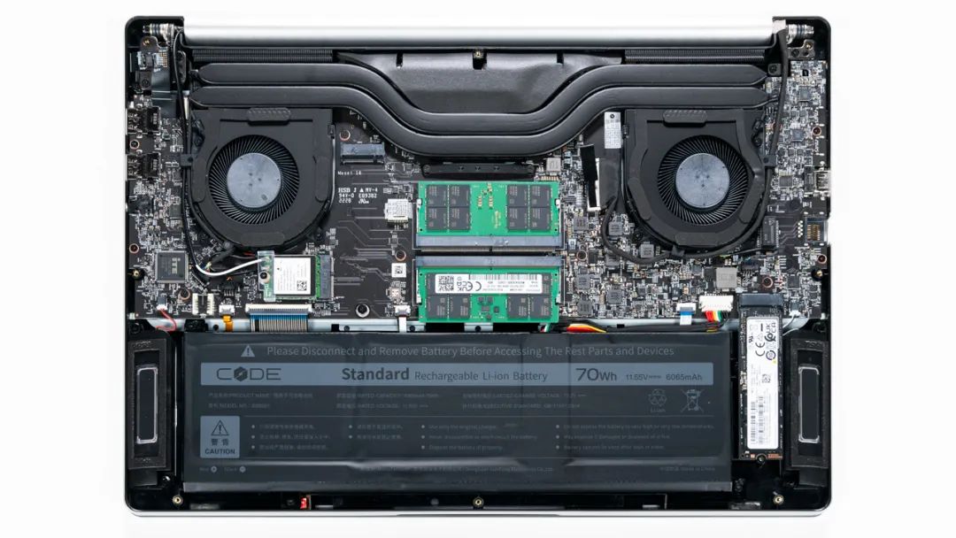上图是机械革命 Code 01的拆机实拍图,双风扇双热管的组合。