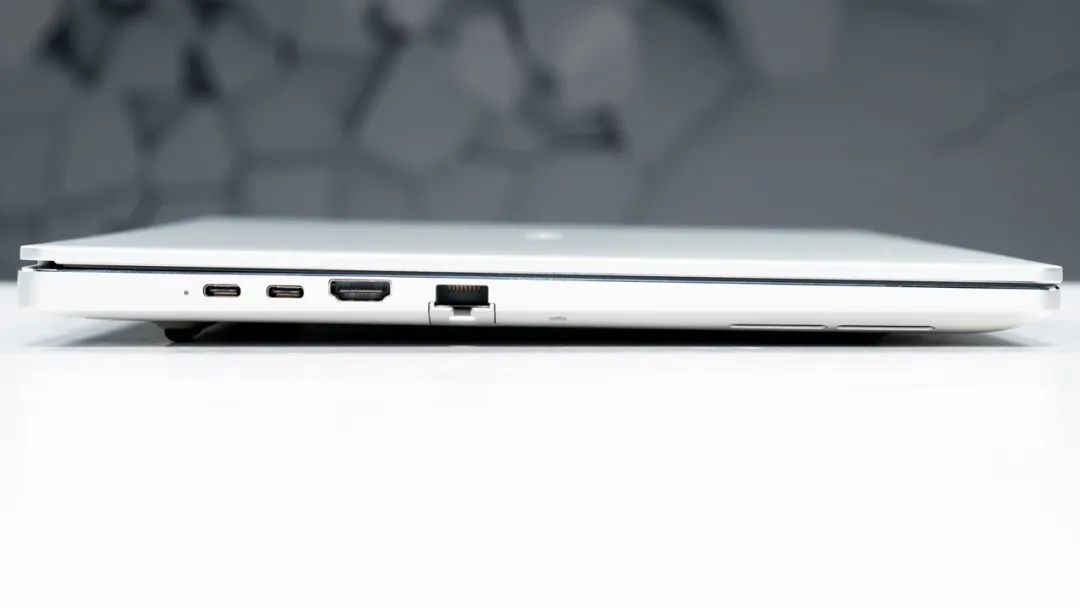 接口方面,机身左侧有两个USB4(支持PD充电和DP1.4)、HDMI2.1、RJ45网口;