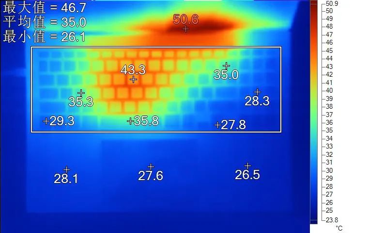 表面温度如上图所示,键盘键帽最高43.3℃出现在键盘Y键周围区域,WASD键为35.3℃,方向键27.8℃。左腕托温度为28.1℃,背面中心点36.2℃。