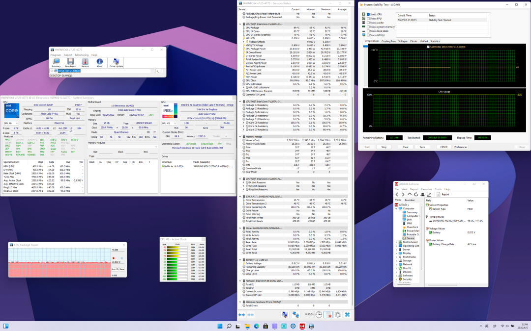 使用负载更高的Stress FPU进行测试,CPU温度最高89℃,功耗22W,P核频率2.0GHz,E核频率1.8~1.9GHz。