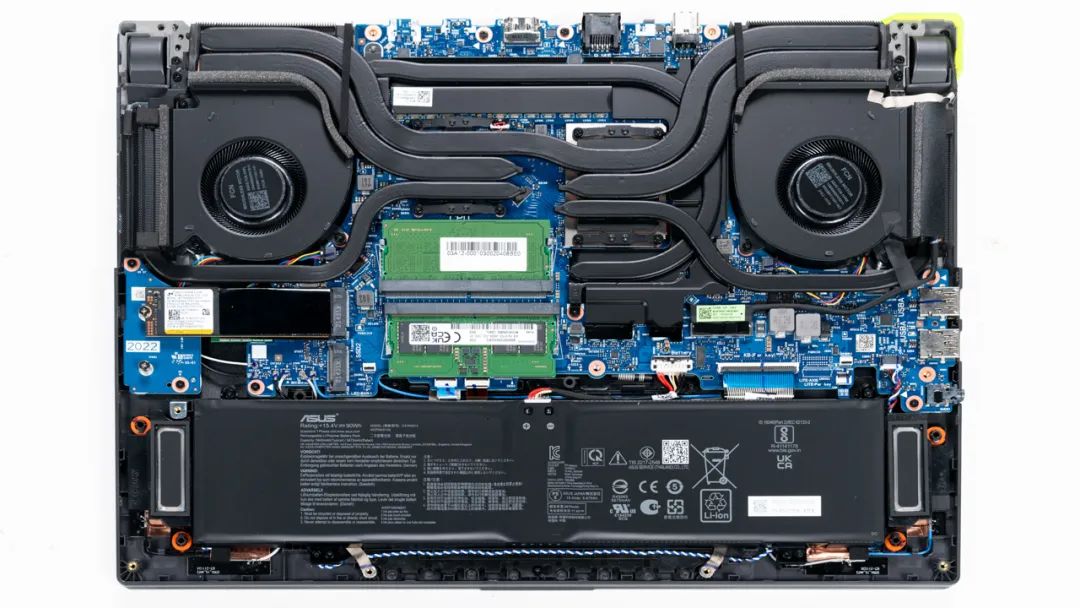 上图是ROG 魔霸新锐 2022款的拆机实拍图,六热管双风扇的组合。