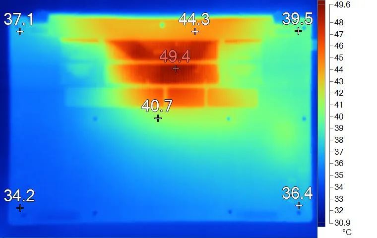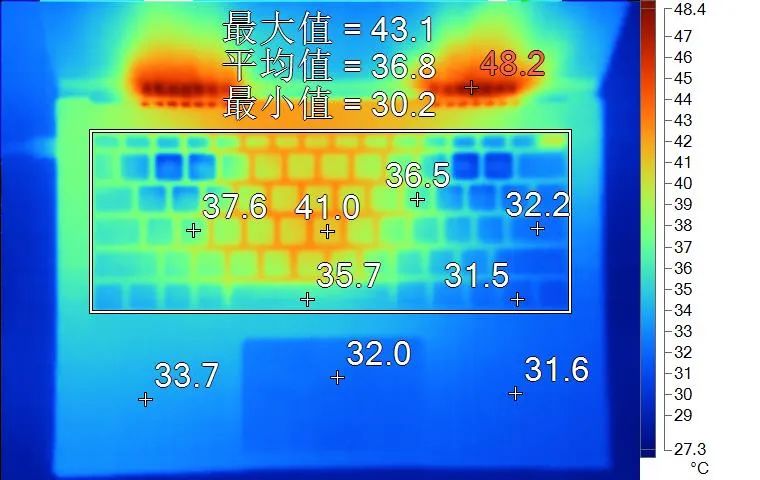 表面温度如上图所示,键盘键帽最高41.0℃出现在键盘中间位置,WASD键区域为37.6℃,方向键31.5℃。左腕托温度为33.7℃,背面中心点40.7℃。