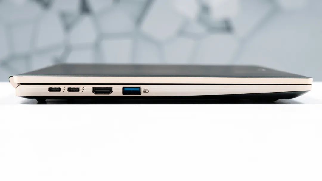 接口方面,机身左侧有两个雷电四、HDMI2.0、USB3.2 Gen1 Type-A接口;
