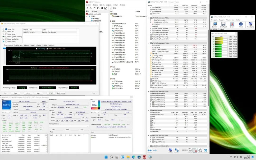 在满载状态下,CPU温度最高100℃,稳定在81℃,功耗28W,P核频率3.1GHz、E核频率2.5GHz。