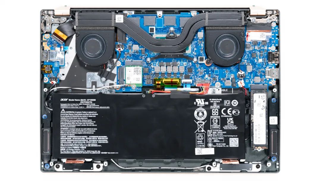 上图是宏碁 非凡S5 Pro的拆机实拍图,双风扇双热管的组合。