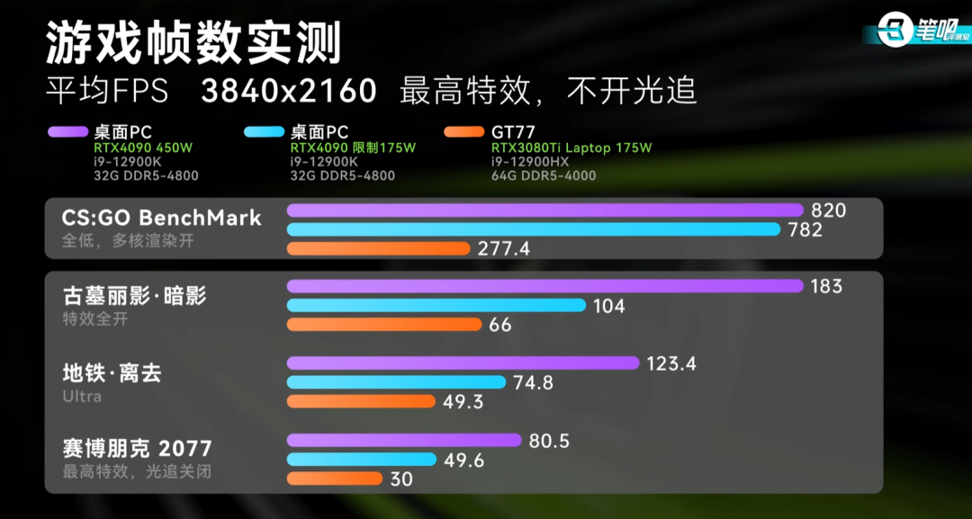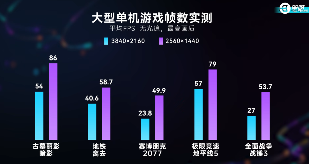 总而言之,对于RTX30系游戏本来说,4K分辨率太勉强了,能畅玩4K游戏的笔记本几乎没有。