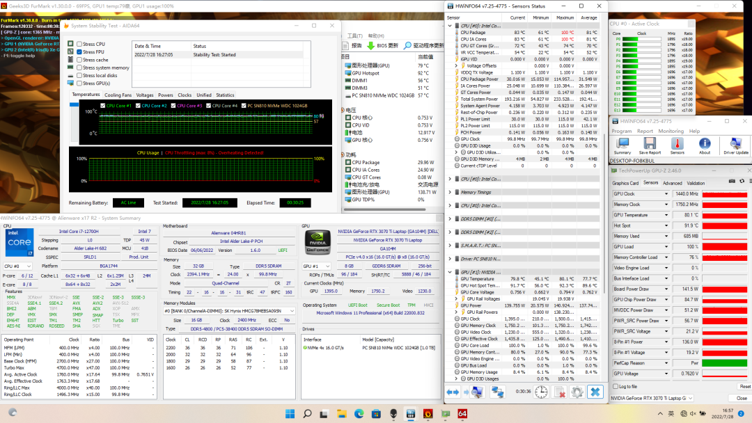 CPU温度最高100℃,稳定在83℃左右,功耗30W,P核频率1.8~1.9GHz左右,E核频率1.7GHz;