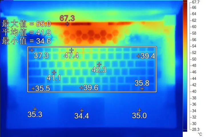表面温度如上图所示,键盘键帽最高47.4℃出现在功能键F5处,WASD键附近约为41.1℃,方向键35.8℃。左腕托温度为35.3℃。