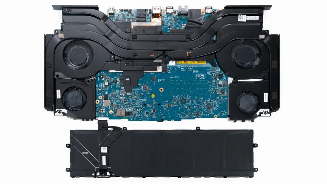 上图是ALIENWARE x17 R2的拆机实拍图,四风扇四热管的组合。