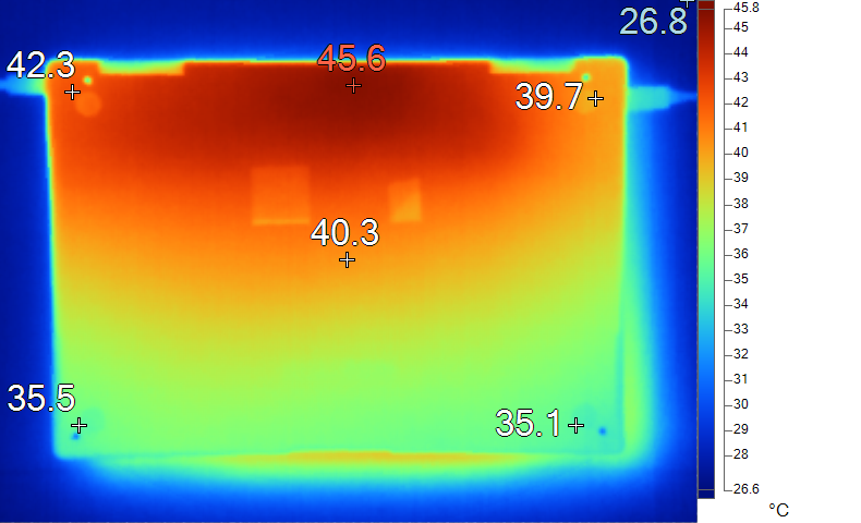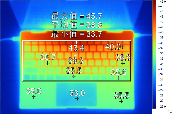 表面温度如上图所示,键盘键帽最高43.4℃出现在键盘F键区域,WASD键为36.7℃,方向键35.6℃。左腕托温度为35.0℃,背面中心点40.3℃。