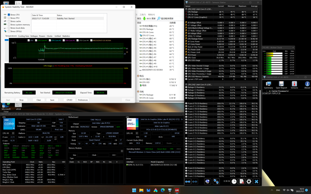 在满载状态下,CPU温度最高88℃,稳定在68℃,功耗受到PL1限制稳定在8W左右,P核频率维持在1.9GHz,E核1.4GHz。