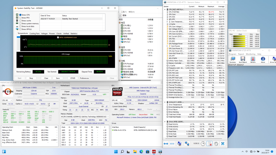 在满载状态下,CPU温度最高90.4℃,稳定在71.8℃,功耗15W,频率维持在3.4GHz。