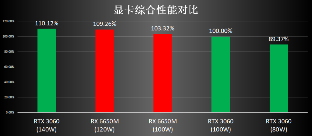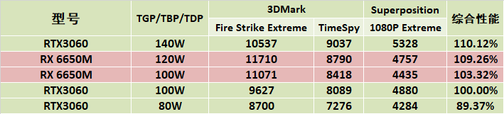 在120W功耗下,Radeon RX 6650M与140W满血的RTX3060跑分几乎相当,功耗降低到100W时,表现比同功耗的RTX3060更好,可见能效比是这代AMD平台的特点,不管是GPU还是CPU都比竞品有优势。