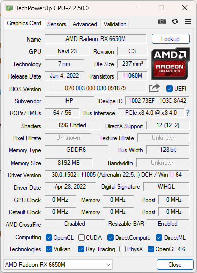 Radeon RX 6650M使用了Navi23核心,1792个流处理器(GPU-Z识别错误),与桌面端的RX6600为同一规格,显存也是128bit 8GB。