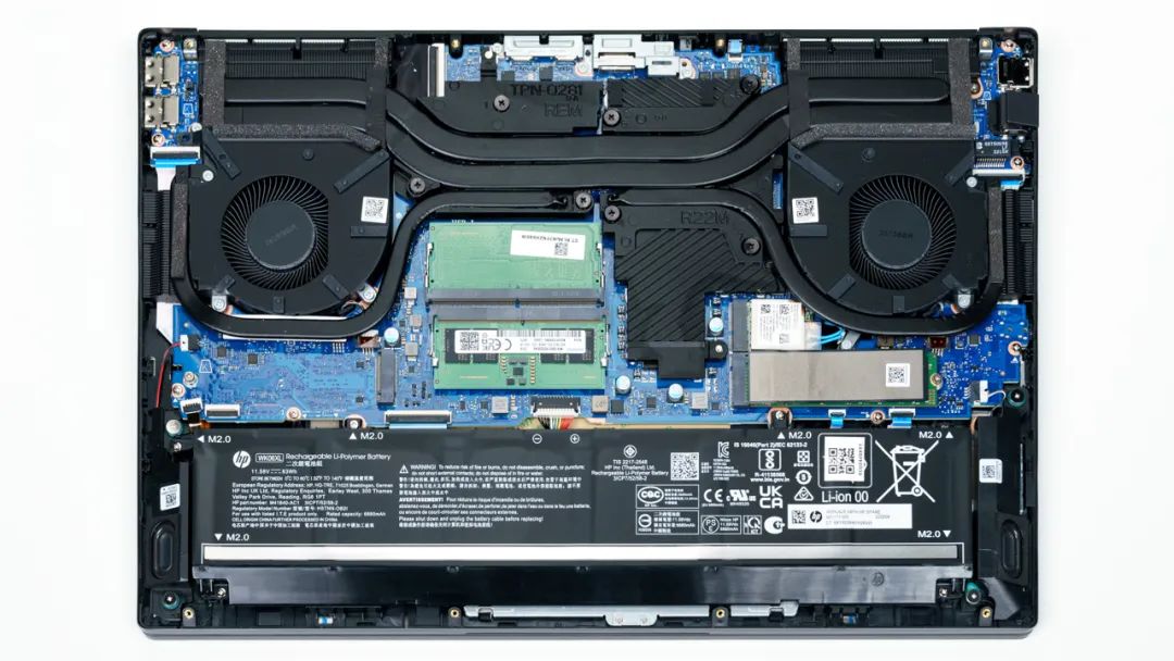 上图是OMEN 暗影精灵8Pro 锐龙版的拆机实拍图,五热管双风扇的组合,其中一根隐藏在显卡底座下方,与其他版本规格一致。