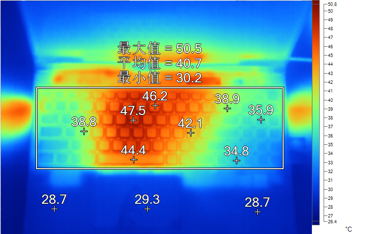 表面温度如上图所示,键盘键帽最高47.5℃出现在键盘中部,WASD键附近约为38.8℃,方向键34.8℃。左腕托温度为28.7℃。