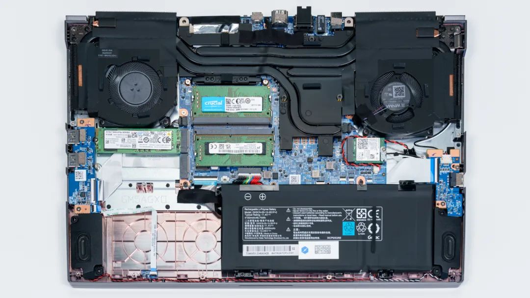 上图是机械革命 极光Z的拆机实拍图,4热管双风扇的组合,模具代号为GM5PGEE,是上一代极光Air的同模具迭代款。