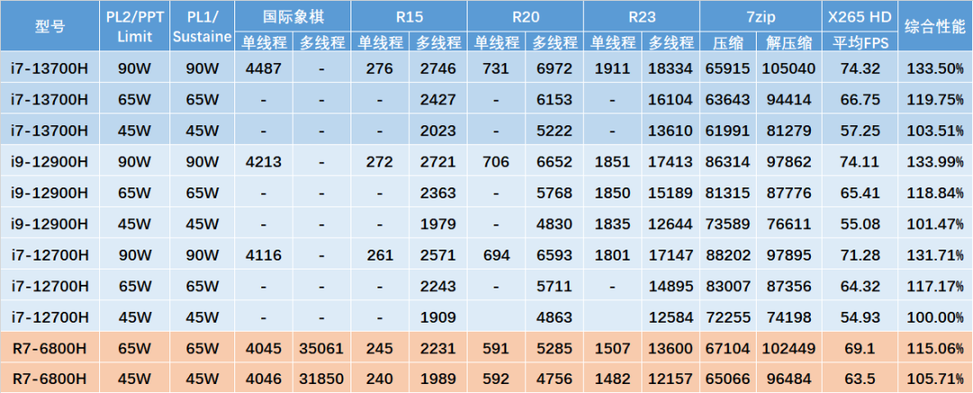 相比AMD的R7 6800H在45W时表现略逊,而在65W时则有4%的领先,可惜去年我们没有收集到90W的6800H数据,不过根据一贯的表现推断,更高功耗下Intel应该会有更大幅度的领先。