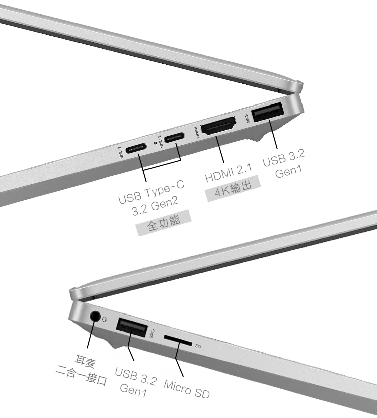 在机身接口方面,机身左侧依次为3.5mm音频接口、USB Type-A 5Gbps、Micro SD卡槽(2.0速率);机身右侧为USB Type-A 5Gbps、HDMI2.1,以及双全功能Type-C 10Gbps接口。
