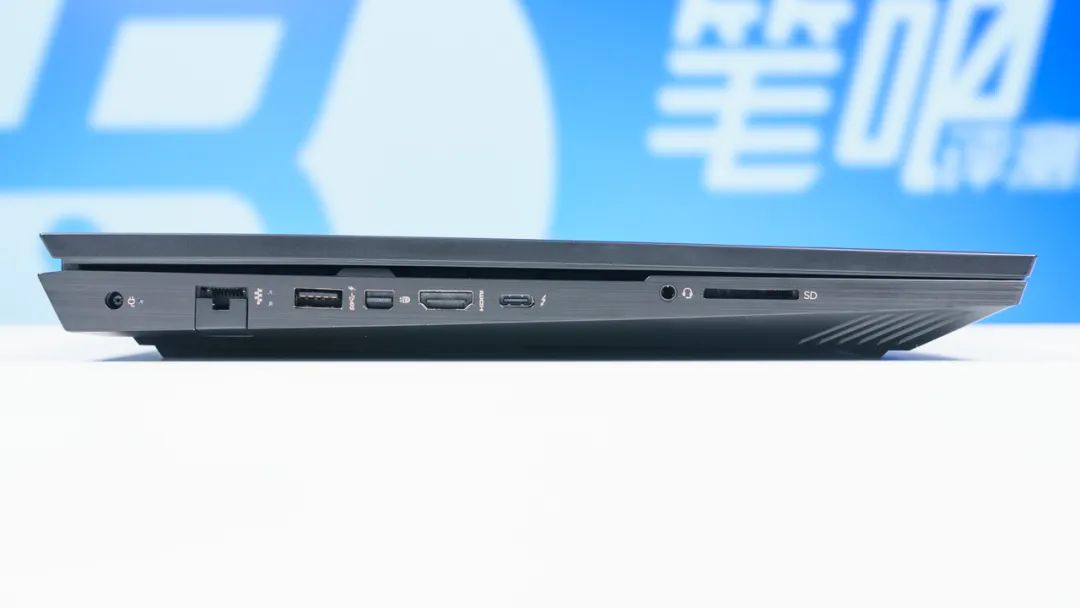 接口方面,机身左侧依次为电源接口、RJ45网口、USB-A 5Gbps、miniDP、HDMI2.1、雷电4、3.5mm音频接口、SD卡槽(UHS-I速率);