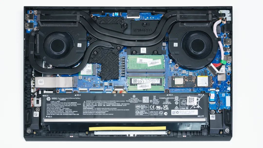 上图是OMEN 暗影精灵9 Plus高能版的拆机实拍图,四热管双风扇的组合,有一根隐藏热管位于显存处。