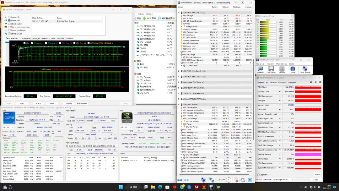 显卡依然撞温度墙,功耗165W,频率1890MHz。
