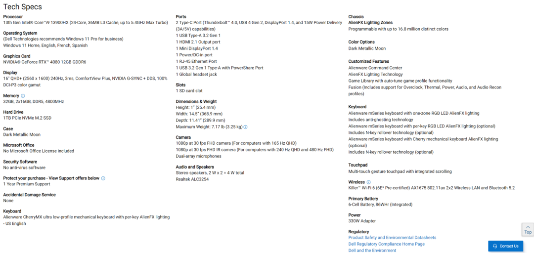 这款机型的 CPU、GPU、内存和存储选项与 m18 完全相同。Alienware m16 还可以选配 Intel Raptor Lake-HX 和 AMD Dragon Range 处理器,显卡可选 RTX 40 系列和 Radeon RX 7600M XT,内存和存储最大分别为 64 GB 和 9 TB。