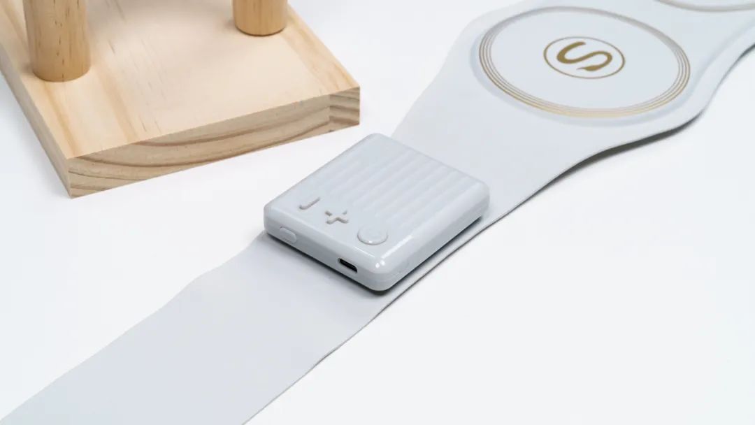 控制盒采用独立设计,通过触点与滑槽与腰带本体连接,方便拆卸后水洗。按键包括开机键、力度调节+-键,以及侧面的热敷按钮。