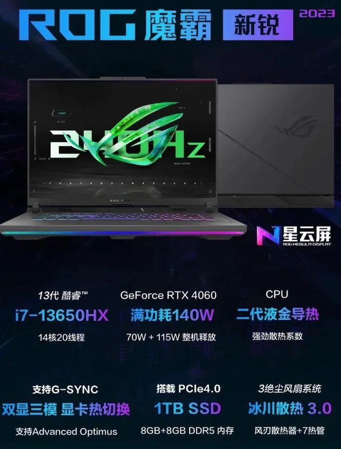 ROG 魔霸新锐 2023 现已开启预售,搭载 13代酷睿 i7 HX 系列处理器,配备 RTX 4060 独显,首发 9999 元。