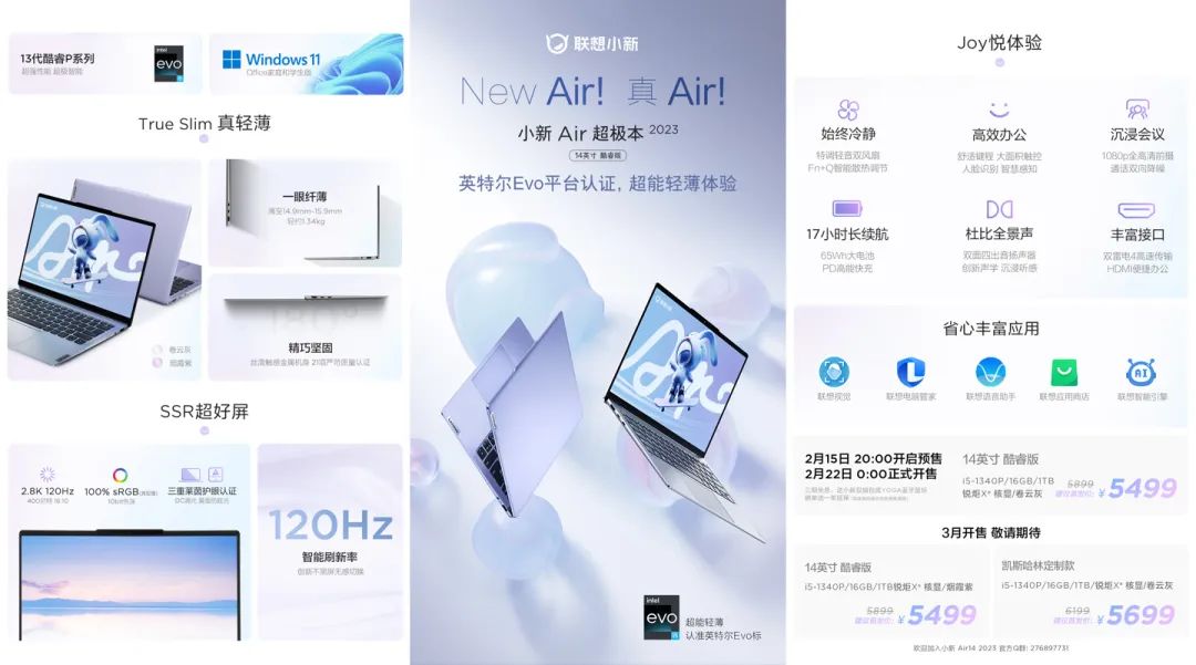 联想今日发布小新 Air 14 2023 超级本,搭载 13代酷睿 P 系列处理器,主打轻薄便携,售价 5499 元起。