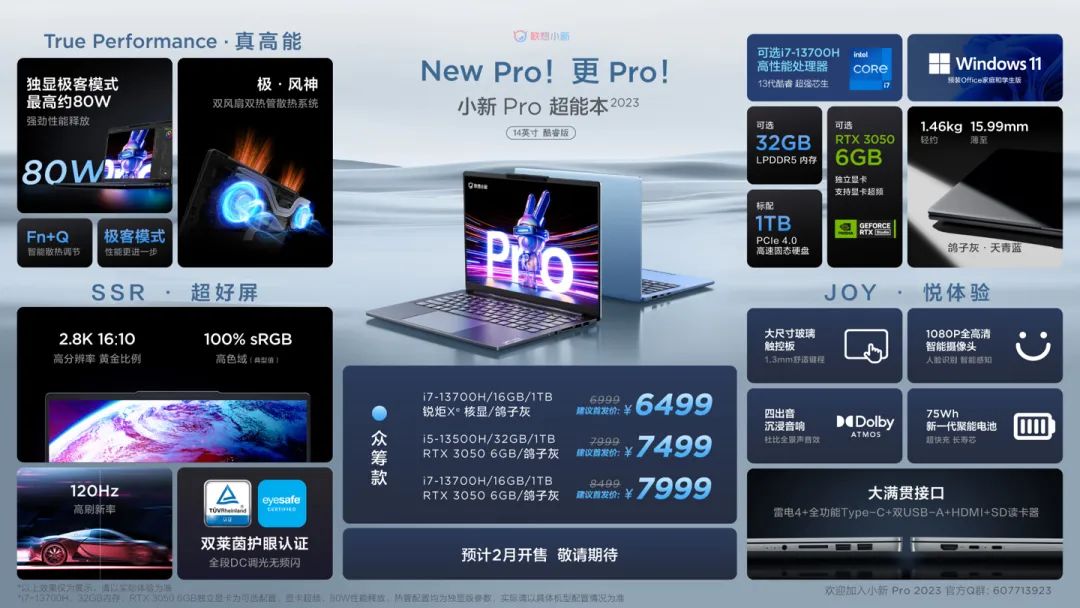 小新 Pro 14 2023 酷睿版可选 i5-13500H 和 i7-13700H 处理器,首发核显版本,RTX 3050 6GB 独显版将在 2 月开启众筹,3 月上市。小新 Pro 14 2023 酷睿版性能释放提升到了 80W,机身只有 15.99mm 厚,重量为 1.46kg。