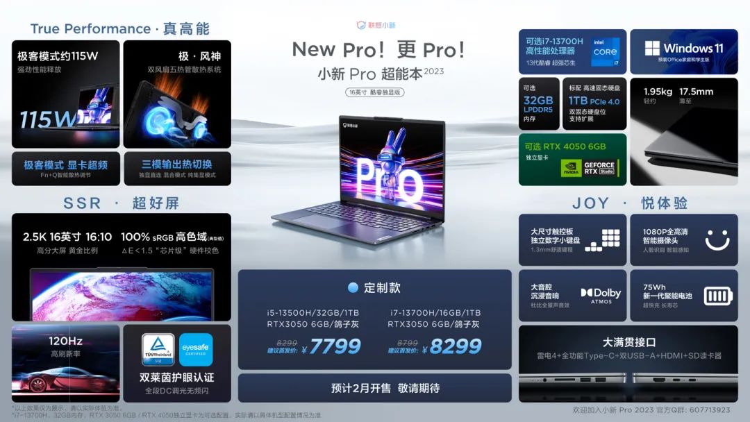 联想今日发布小新 Pro 14 和小新 Pro 16 的 2023 酷睿版,搭载 13代酷睿 H 系列处理器,标配 1TB SSD,可选 32GB 大内存,有 RTX 3050 和 RTX 4050 独显可选,首发价如下: