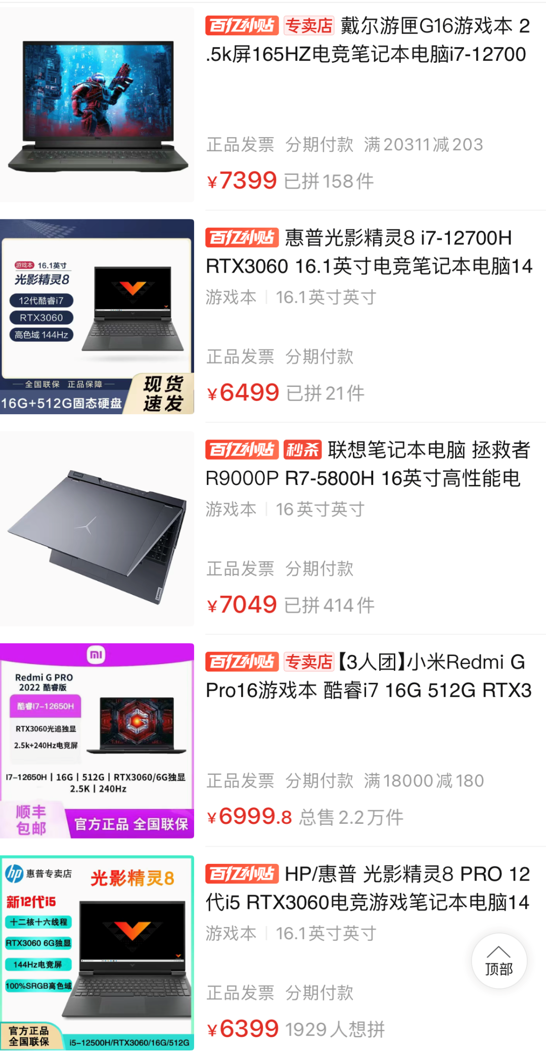 众所周知,拼多多只要上补贴,价格一般是业内最低的,我搜了一下【3060游戏本】截了一些在补贴的产品出来: