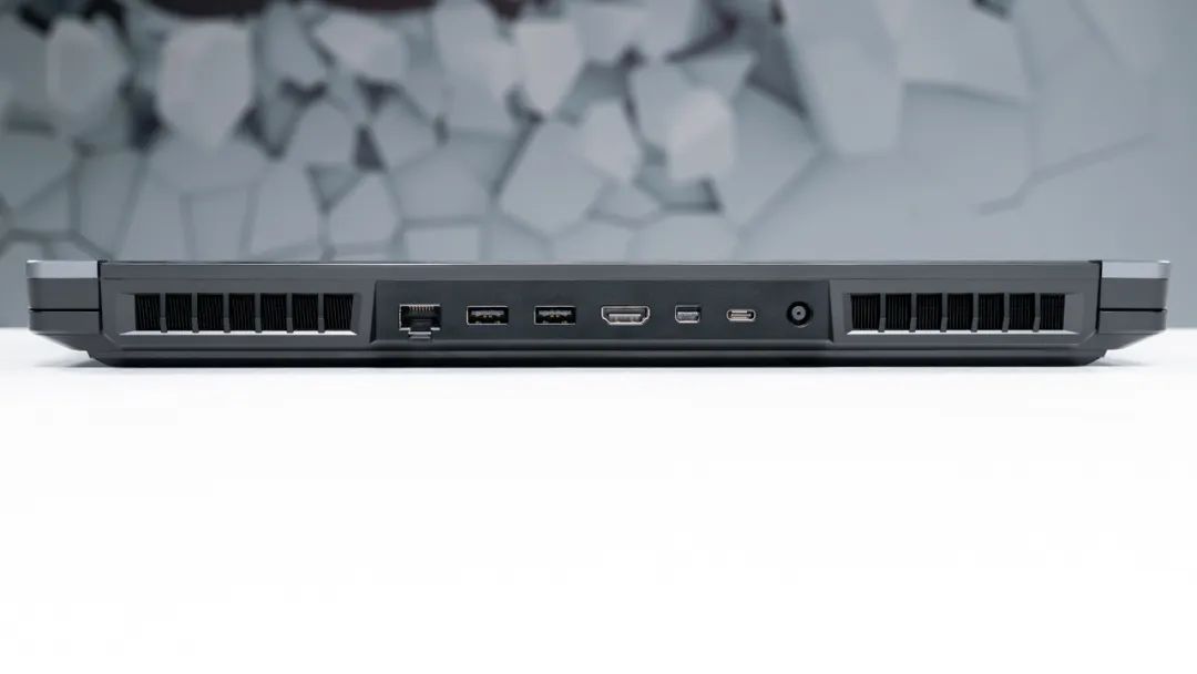 机身后侧依次为RJ45网口、两个USB3.2 Gen2 Type-A、HDMI2.1、miniDP1.4、全功能Type-C、电源接口。
