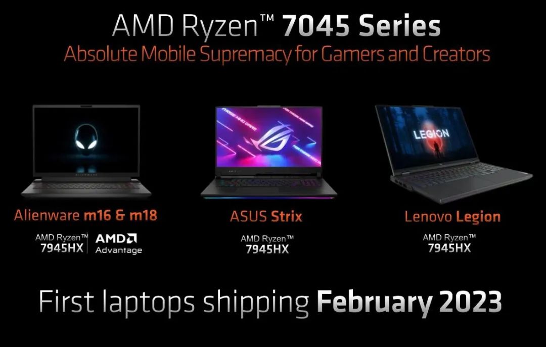 AMD 表示,外星人 m16/18、ROG Strix 系列和联想拯救者笔记本将搭载 R9 7945HX 旗舰处理器,其中外星人型号还将搭载 AMD 的 RX 7000M 笔记本独显。