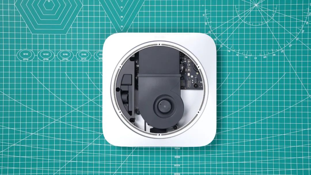 上图是Mac mini的拆机实拍图,单风扇配上一块鳍片,鳍片直接覆盖在核心上,没有热管。风扇从底部进风直吹鳍片,通过后方接口处的开口排出热风。