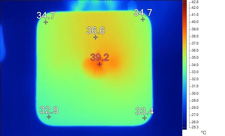 表面温度如上图所示,机身正面的最高39.2℃出现在苹果LOGO上,机身大部分温度都在30℃左右。