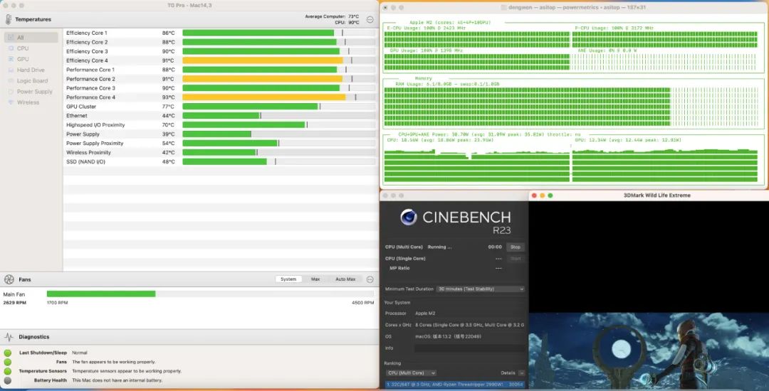 总的来说,Mac mini的散热表现没问题,M2本身能耗比极高,这点散热规模完全够用了。