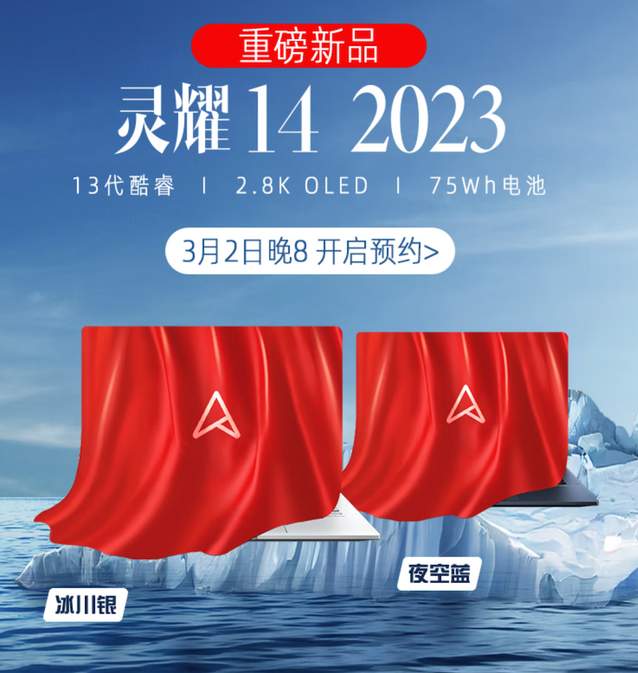 华硕灵耀 14 2023 轻薄本将在 3 月 2 日开启预约,可选冰川银和夜空蓝两种配色,13代酷睿 + 2.8K OLED 屏配置,内置 75Wh 电池。